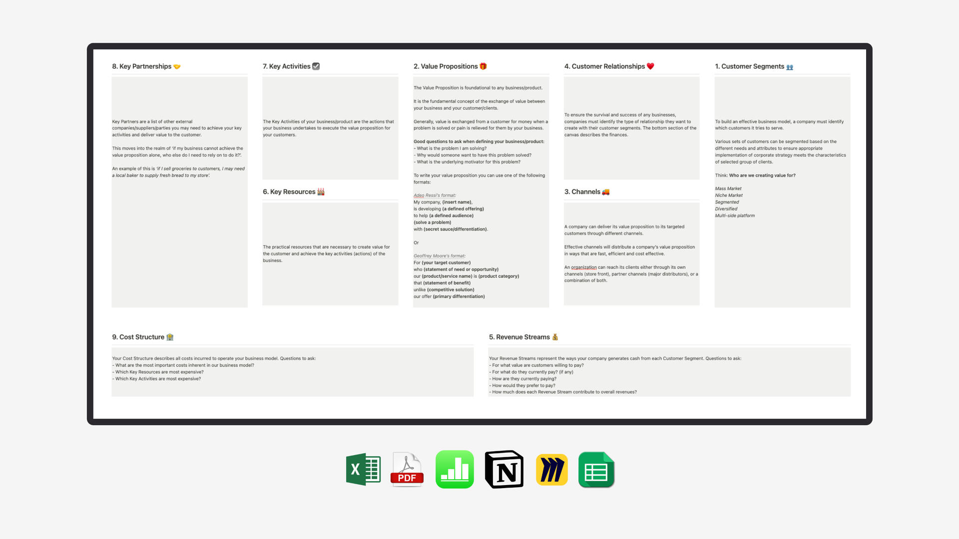 You can download and use the MVP Experiment Canvas for FREE and start validating your business idea with a Minimum Viable Product today.Click the orange button below to request a link to download the canvas in different file formats (PNG, PDF, Notion, Miro, Google Sheets, Excel, and Numbers).